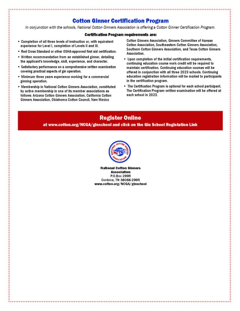 The National Cotton Ginners Association has opened up Gin School registration.  Here are the details: